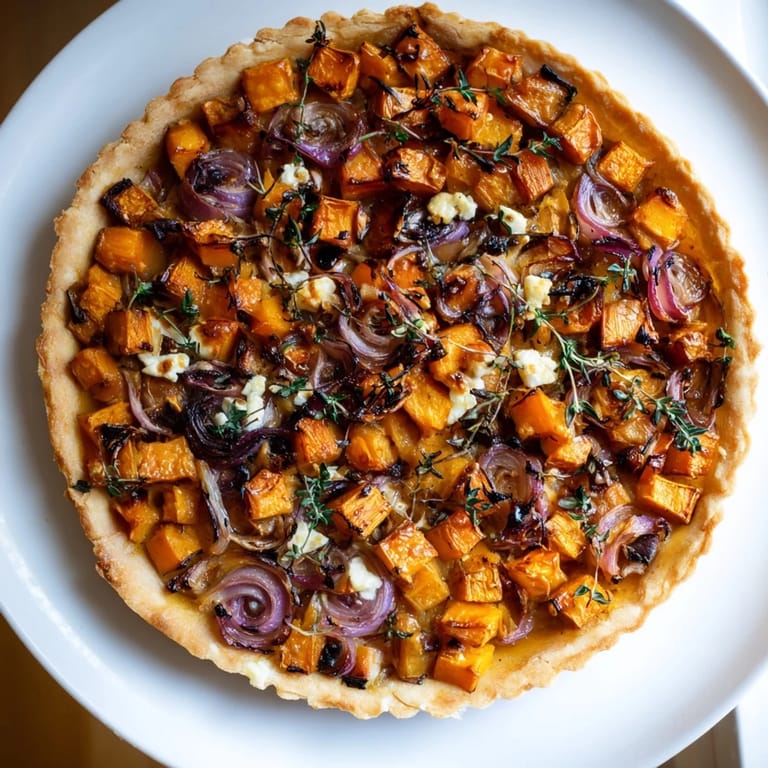 Sweet potatoes and butternut squash add natural sweetness and texture, ideal for roasting and layering in this tart.