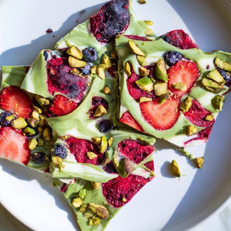 Save I stumbled onto this frozen yogurt bark while standing in my kitchen on an unexpectedly hot afternoon, staring at a container of Greek yogurt and wondering if I could turn it into something more interesting than just breakfast. What started as an experiment in layering flavors—matcha, pistachio, berries—became the kind of treat I actually crave now, not because it's virtuous, but because it tastes like you put real thought into it. The swirled colors remind me of artist's palettes, and the texture is somewhere between creamy and crunchy in a way that feels intentional. Best of all, it takes fifteen minutes of actual work before it disappears into the freezer to do the heavy lifting.