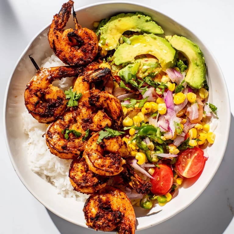 Save A fresh and vibrant bowl featuring juicy grilled shrimp, creamy avocado, sweet corn, and zesty lime over fluffy rice: a perfect light meal for summer.