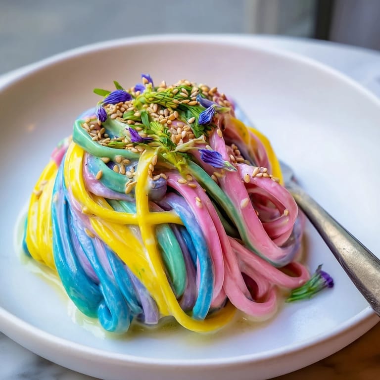 Save A vibrant, whimsical noodle dish featuring colorful noodles nestled in a soft, cloud-like creamy sauce. Perfect for parties or to delight kids and adults alike.