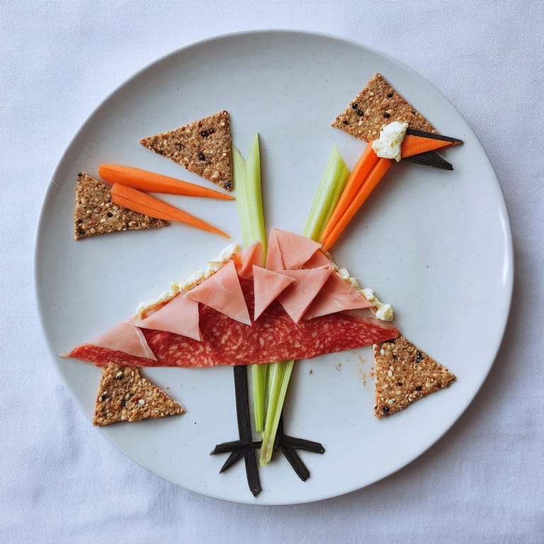 - Place triangular crackers beneath and alongside your meat layers, following the imaginary lines of the crane's body and wings. Think of them as the negative space that makes the shape readable—without them, it's just folded meat; with them, it becomes a bird.