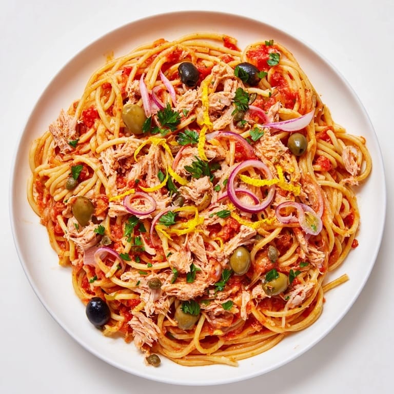 Save A vibrant, Mediterranean-inspired pasta dish featuring flaky canned tuna, briny olives, and tangy capers in a savory tomato sauce. This recipe brings bold Italian flavors to your weeknight table, making dinner simple yet satisfying.