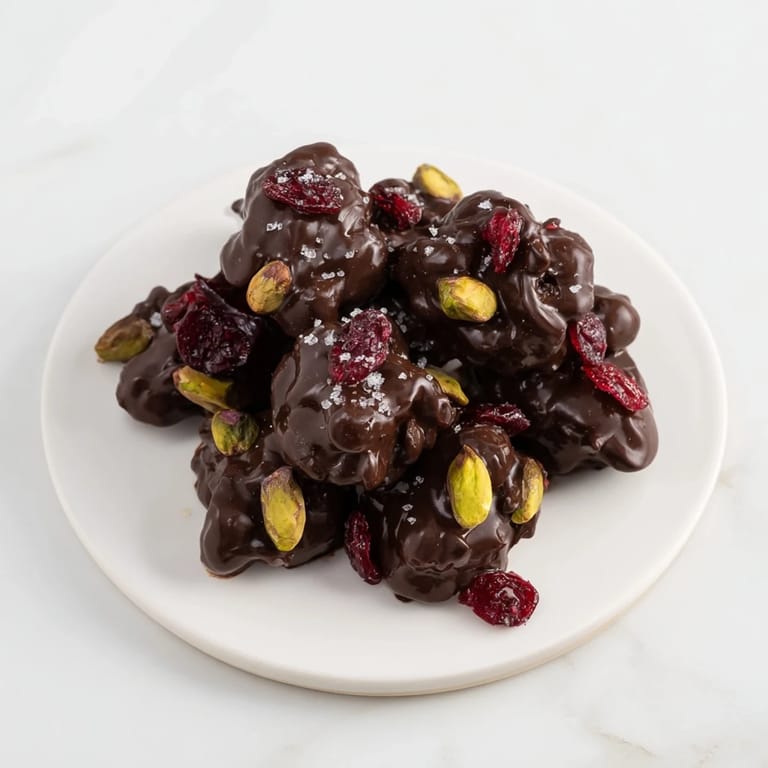 Save Elegant, bite-sized clusters combining roasted pistachios and tart dried cranberries, bound with smooth dark chocolate for an irresistible gourmet snack.