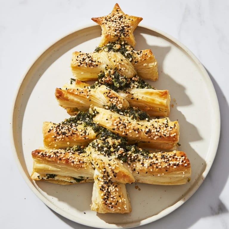 Save Celebrate the holidays with this charming Puff Pastry Christmas Tree Appetizer, a delightful and savory treat that combines flaky puff pastry with a rich herbed cheese and basil pesto filling. Shaped like a festive Christmas tree, this recipe is easy to prepare and perfect for sharing with friends and family at any seasonal gathering. The golden-brown crust and twisting branches make it as visually impressive as it is delicious.