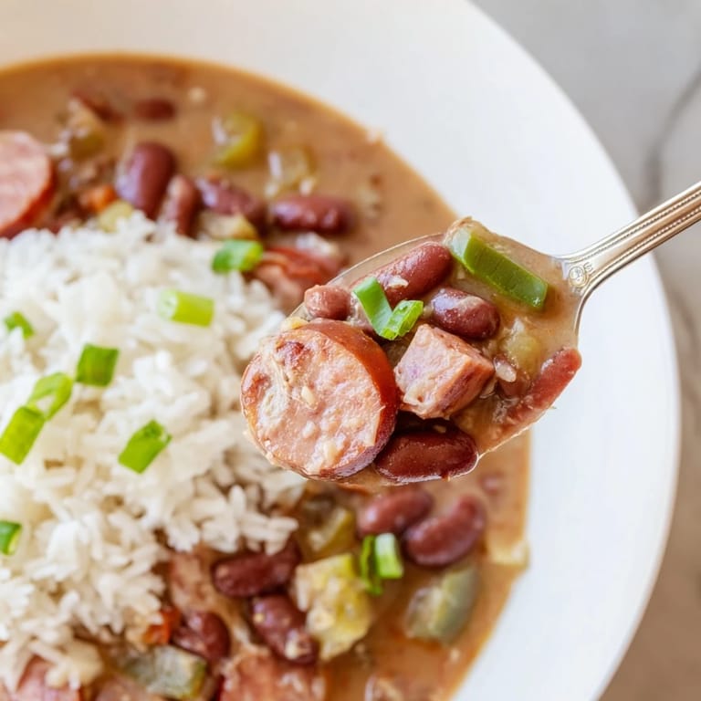 Save A classic Creole dish featuring tender red beans simmered with smoky sausage and aromatic vegetables, served over fluffy white rice. Hearty, flavorful, and perfect for a comforting meal.