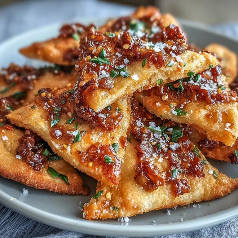 Save My friend Sarah showed up to a dinner party with these naan chips, and I watched everyone ignore the main course to hover around the appetizer plate. The smell of garlic and chili crisp hitting the oven was intoxicating, and when she drizzled that cool, tangy cucumber dip next to them, I understood why she kept the recipe close to her chest. It's the kind of dish that feels fancy enough to impress but casual enough to make on a Tuesday night when you want something crunchy, spicy, and absolutely addictive.