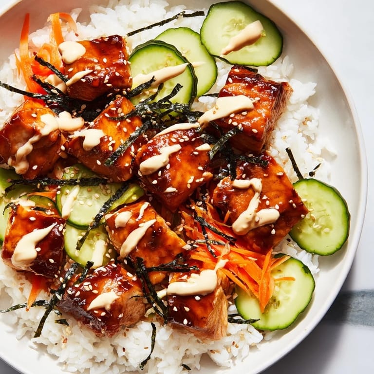 Save I discovered this bowl on a lazy Sunday afternoon when I had salmon that needed using before it went bad, leftover rice cooling on the counter, and an inexplicable craving for something vibrant and a little bit fancy. No recipe, just instinct—I threw together a quick teriyaki glaze from pantry staples, pan-seared the salmon until it glistened, and suddenly I had something that tasted like it came from one of those trendy restaurants I keep seeing online. My partner took one bite and asked when I'd learned to cook like this, which made me laugh because honestly, I was just improvising.