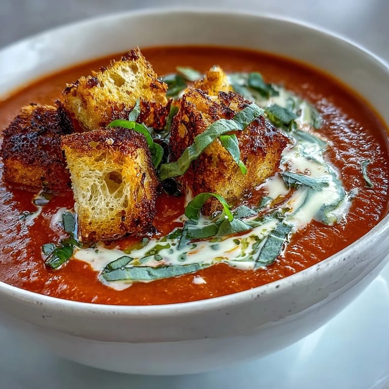 - Ladle the soup into bowls and top each one with a handful of your crispy croutons, a swirl of extra cream, and a few fresh basil leaves. The contrast between the smooth soup and the crunchy croutons is honestly what makes this feel special.