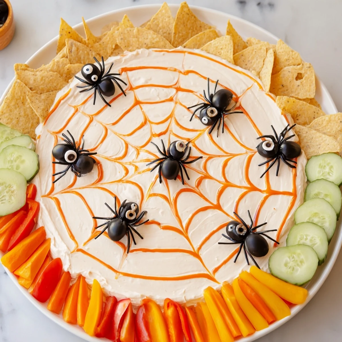 Save Bring a touch of spooky fun to your next Halloween party with the Creepy Crawly Spiderweb Platter. This eye-catching appetizer features a creamy dip with a perfectly piped spiderweb design, surrounded by crunchy veggies and tortilla chips ready for dipping. The edible olive spiders add a creepy yet playful element that's sure to delight guests of all ages and create a festive atmosphere.