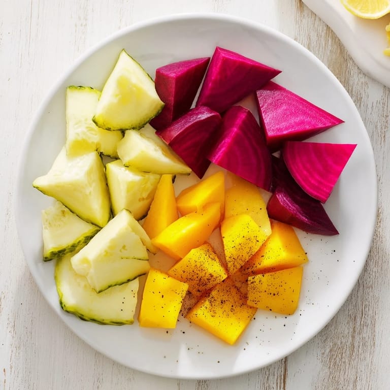 Color is your first ingredient. Golden beets, watermelon radish, ripe mango, pale avocado, and white feta create a palette that feels curated and intentional. If you want to push it further, try purple carrots, yellow bell peppers, or even pink peppercorns for texture. The rule is simple, everything on that plate should be something you'd want to look at for five minutes straight.
