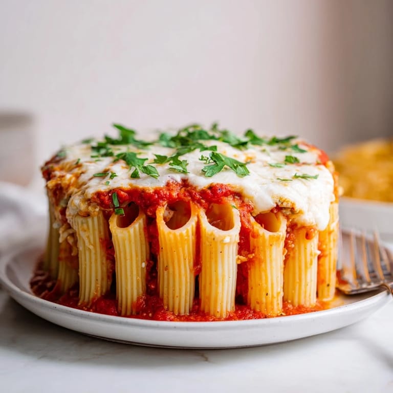 Save A stunning baked rigatoni dish where pasta stands upright, filled with rich tomato sauce, creamy ricotta, and gooey melted cheese—perfect for impressing guests and feeding a crowd.