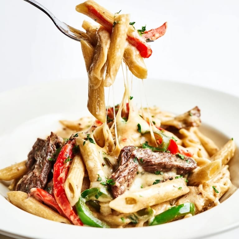 Save A hearty pasta dish inspired by the classic Philly cheesesteak, featuring tender beef, sautéed peppers and onions, and a creamy cheese sauce tossed with pasta.