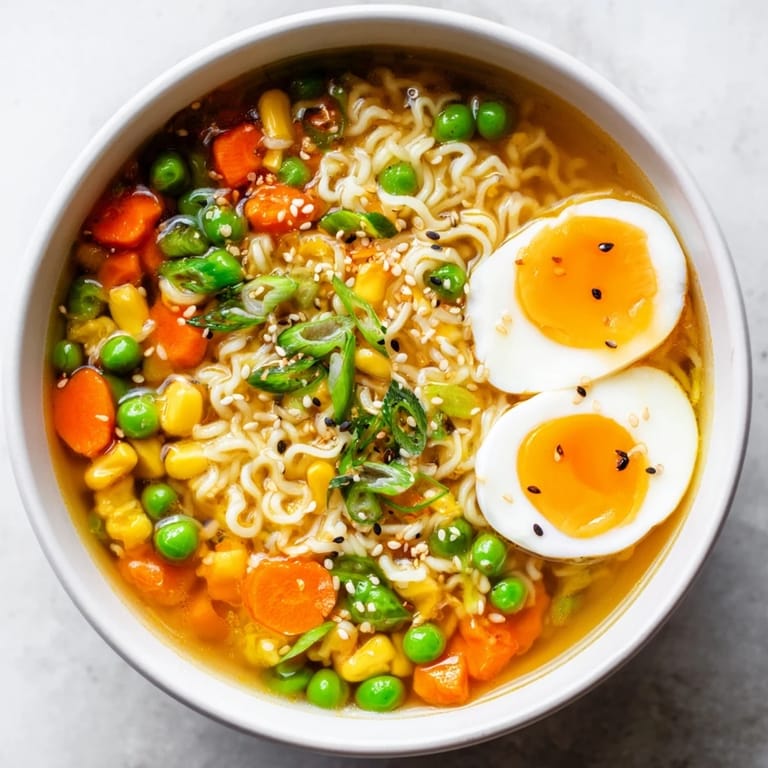 Save Late nights studying used to mean a bowl of plain instant ramen, the kind that tastes like salty regret. Then one winter, I opened my freezer hunting for dinner and spotted a bag of forgotten peas—the kind that cost a dollar and somehow make everything taste more intentional. Twenty minutes later, I was slurping noodles that actually felt nourishing, not just filling. That small discovery changed how I think about quick meals; they don't have to be boring or feel like a compromise.