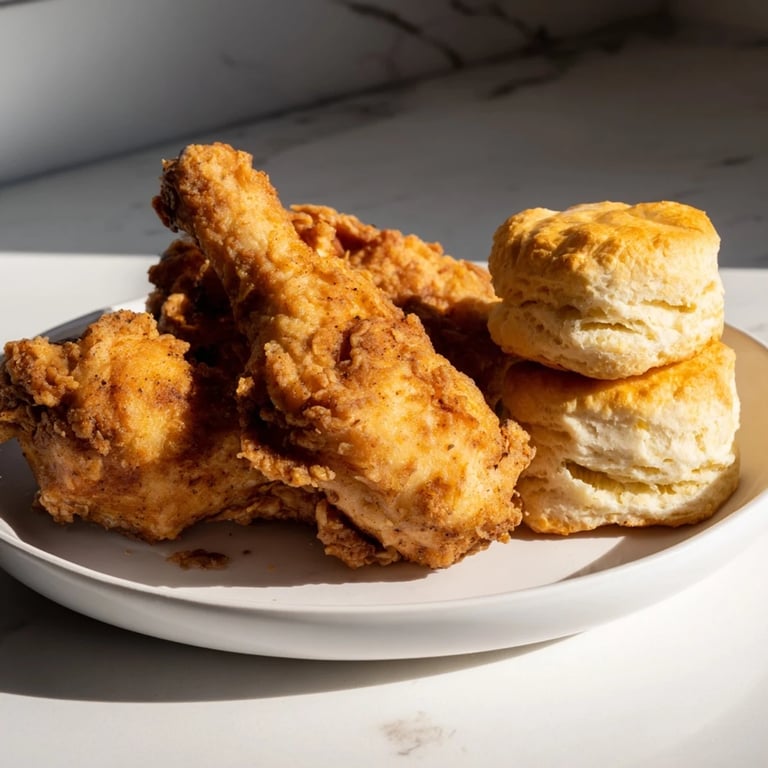 Save Crispy, juicy fried chicken paired with fluffy, buttery buttermilk biscuits—a classic Southern comfort meal perfect for gatherings and family dinners.
