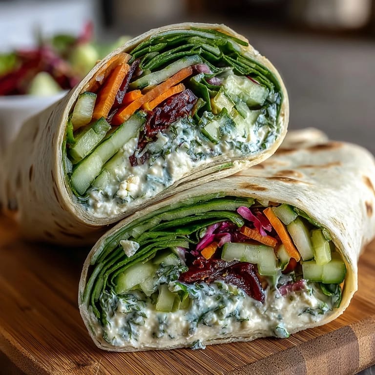 This dish highlights crisp spring vegetables layered with creamy hummus inside bright green spinach tortillas. Fresh baby spinach, carrots, cucumber, red bell pepper, radishes, and purple cabbage add a colorful crunch, complemented by fragrant herbs and optional avocado or seeds. Ready in about 20 minutes with no cooking, these wraps deliver a refreshing and healthy option ideal for a light meal or snack. Seasoned to taste and served with lemon wedges, they offer vibrant flavors and satisfying texture in every bite.